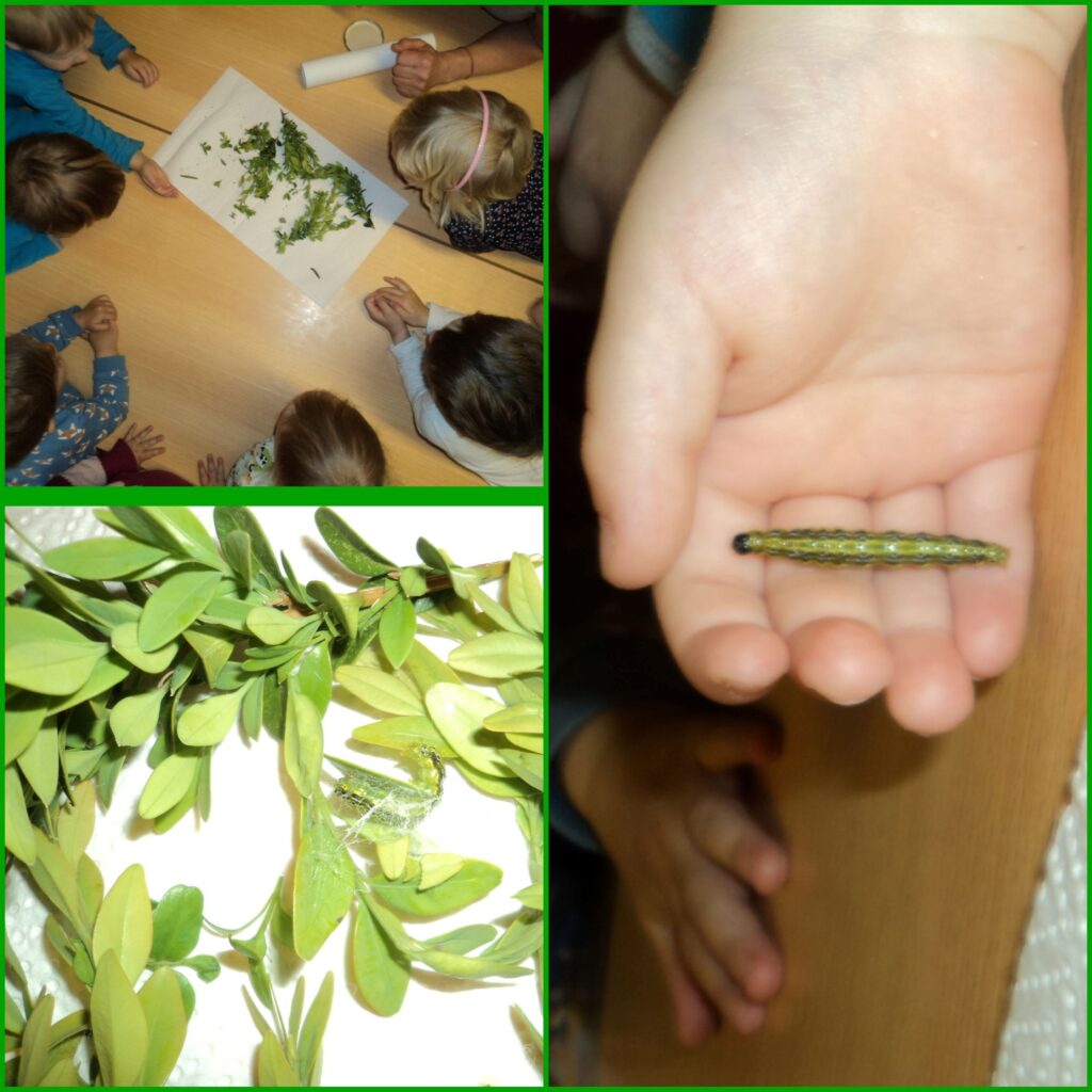 Da der Buchsbaumzünsler auch in Hilbersdorf sehr aktiv ist, war es ein Leichtes, dessen Raupen zu finden. Diese waren handzahm und fanden in unserer Gruppe in einem Buchsbaumblätternest liebevolle Betreuung. Unsere Dosenraupe wurde mit viel Obst und Gemüse gefüttert, bevor wir sie mit einem Wollfaden einspannen. Nun heißt es, warten, bis sie sich in einen Schmetterling verwandelt…und ob die Puppen des Zünslers ausschlüpfen???